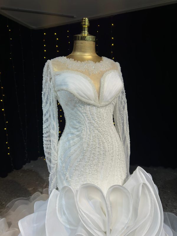 This elegant turtleneck ball gown is the perfect choice for the bride who wants to look both sophisticated and modest. The high neck and long sleeves add a touch of class, while the full skirt creates a dramatic and elegant silhouette. This dress is made from luxurious silk crepe and features delicate lace appliqués.